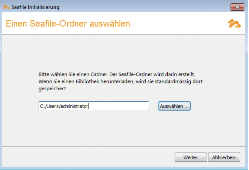 Wählen Sie einen Standard-SeaFile-Ordner aus.Sofern es keine Vorgaben hierfür gibt (siehe SeaFile-Konfigurations-Handout) können Sie die Standardeinstellungen belassen oder gegebenenfalls anpassen.